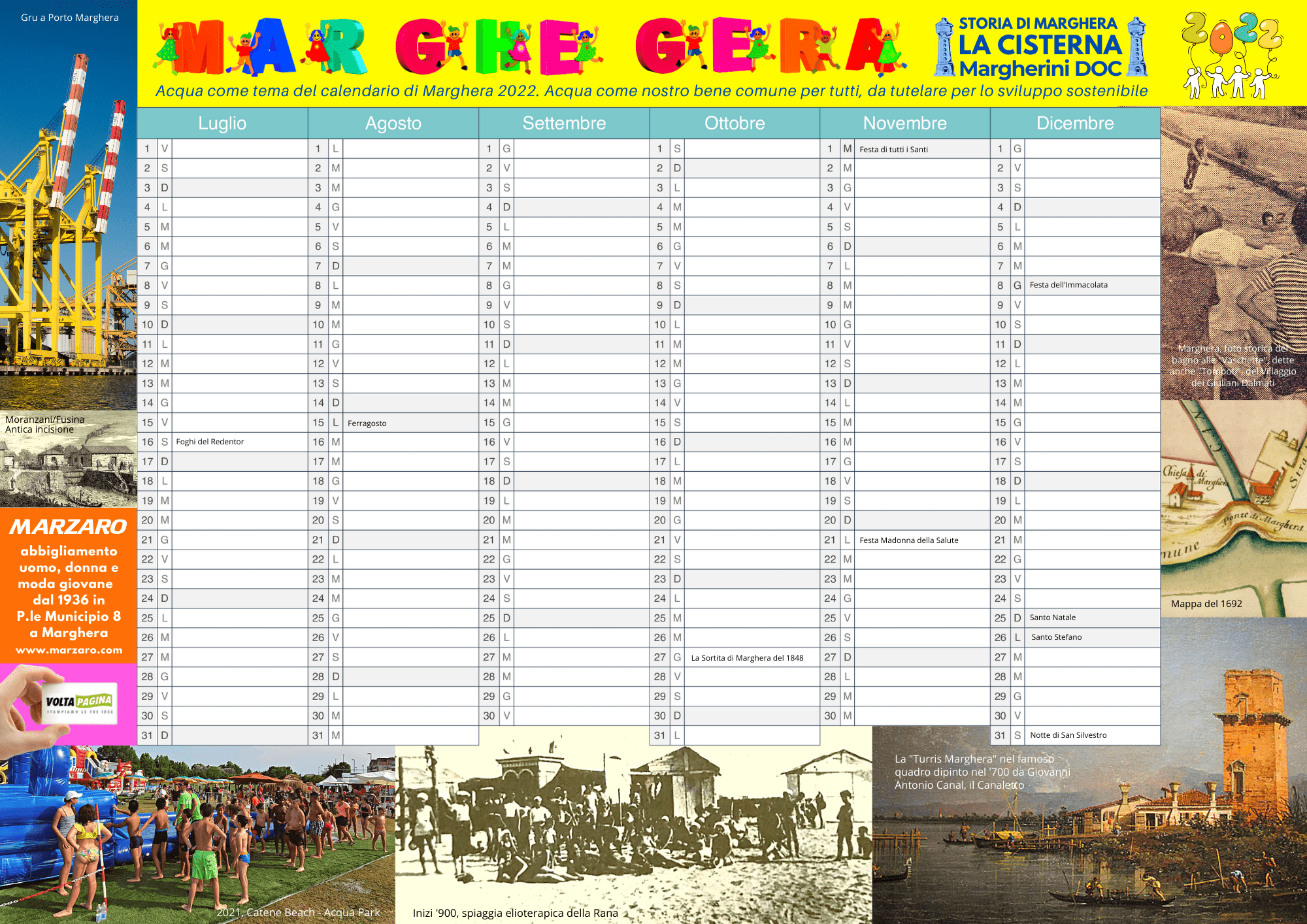 Calendario di Marghera 2022 tema acqua, semestre luglio, agosto, settembre, ottobre, novembre, dicembre
