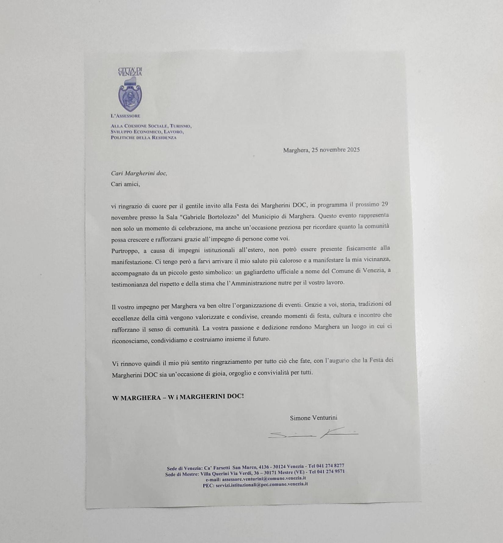 Durante l’evento è stato annunciato che il Premio Margherini DOC 2026 sarà reso ancora più partecipativo e coinvolgente con molte novità. Gli amministratori del gruppo – Massimo Montefusco, Vittorio Baroni, Luca Giugie, Michele Borsetto, Stefano Carlo Curto e Bruno Piasentini – al quale aderiscono oltre 8000 cittadini, hanno apprezzato il gagliardetto ufficiale del Comune di Venezia ricevuto dall’assessore Simone Venturini.