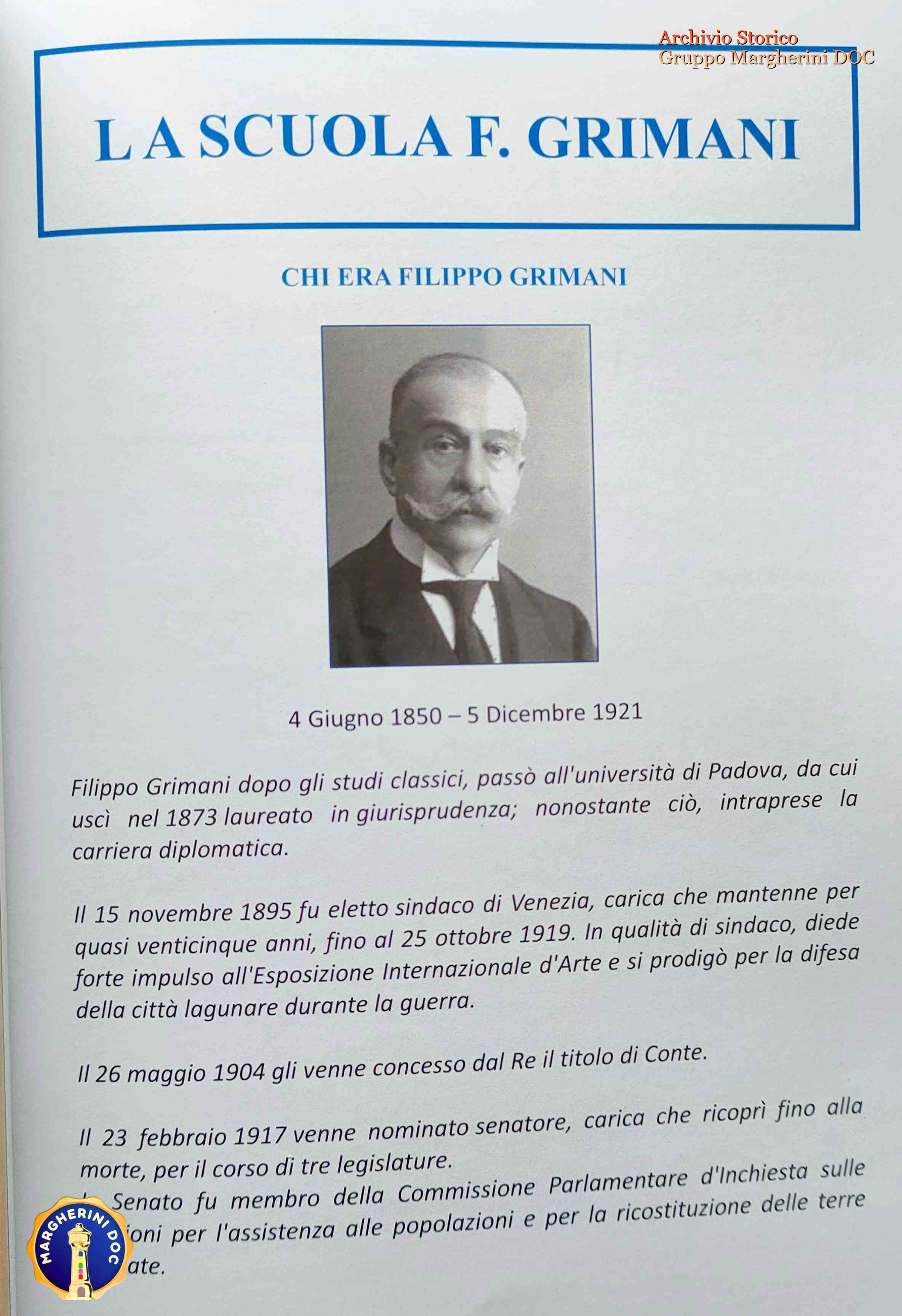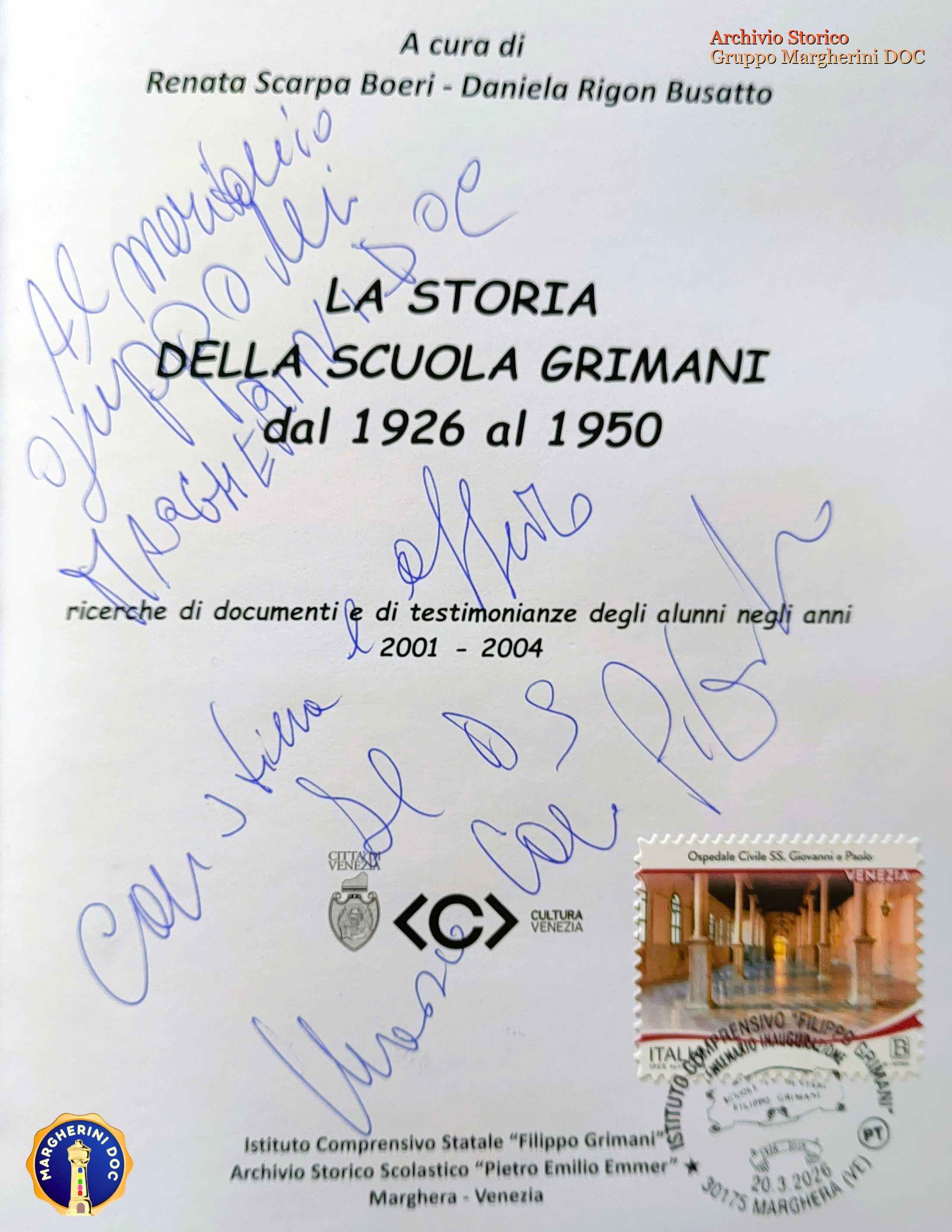 Tra le iniziative più significative del centenario va ricordata la presentazione del volume “La storia della Grimani dal 1926 al 1950”, introdotto da Renata Scarpa Boeri e Daniela Rigon Busatto, maestre di un tempo. Il libro raccoglie documenti e testimonianze rintracciati dagli alunni di ieri, e quindi rappresenta un vero lavoro di recupero della memoria scolastica e cittadina.