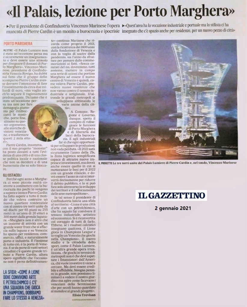 Dalle pagine de IL GAZZETINO il Presidente di Confindustria Venezia lancia una sfida al territorio. Vincenzo Marinese prende ad esempio la lezione del progetto Palais Lumiere e propone di far convivere industria, arte ed economia. Prende a modello la città di Lione dove il petrolchimico convive con la città e produce ricchezza. “Occorre agire come facevano i veneziani della Serenissima che per secoli hanno guardato al mondo e ai grandi progetti”.