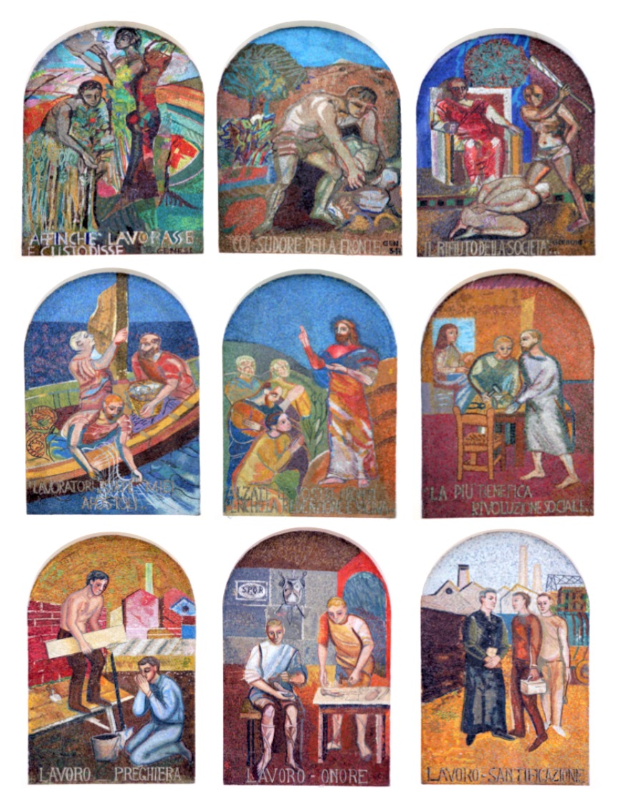 Siccome quest’anno, a causa del Coronavirus, la Festa del Lavoro del 1° Maggio sarà festeggiata in modo insolito, vogliamo mettere in risalto una cosa importante. Si tratta dei nove mosaici raffiguranti il Poema Cristiano del Lavoro nella Chiesa Gesù Lavoratore a Marghera.