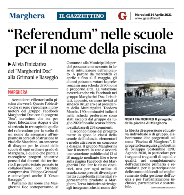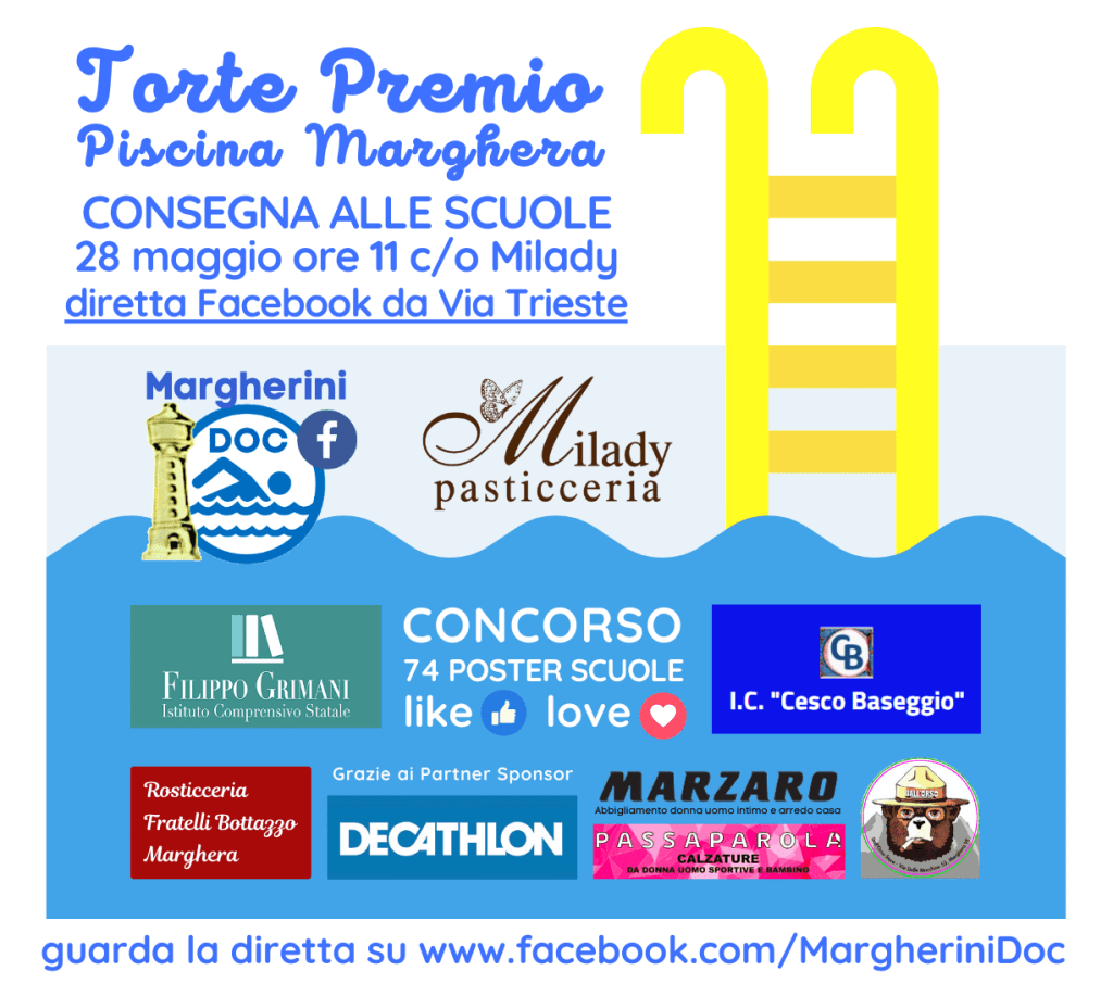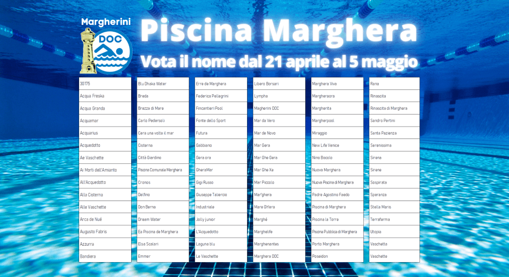 L’iniziativa del gruppo Margherini DOC (7200 iscritti in facebook) ha ottenuto la collaborazione del presidente della Municipalità di Marghera e il sostegno di Pasticceria Milady, Centro Stampa VOLTA PAGINA e Marzaro Abbigliamento. In occasione dell’evento sarà data notizia del numero speciale “La Cisterna” che conterrà una selezione di poesie di Elio Urbinati, poeta margherino del gruppo scomparso lo scorso 17 novembre.
