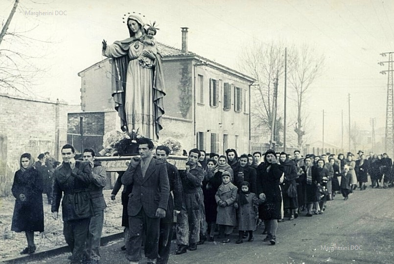 Tra le immagini del calendario una rara foto con la processione della Madonna pellegrina di inizi ‘900 e un’antica mappa del territorio con segnati i toponimi “Malghera” e “Botenigo”.