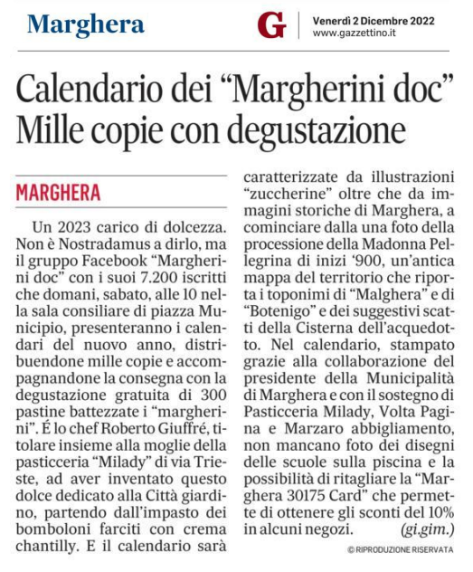 Presentazione calendario di Marghera con i nuovi dolci “margherini”. Sabato 3 dicembre ore 10 al Municipio di Marghera anteprima con la distribuzione omaggio di 1000 calendari e la degustazione gratuita di 300 dolci.